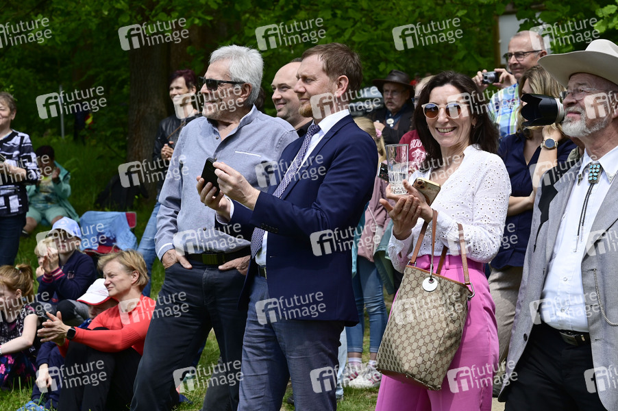 Gojko Mitic mit Freundin Julia und Ministerpräsident Michael Kretschmer bei der offiziellen Einweihung einer Sandstein-Stele in der Nähe des Originaldrehortes des Filmes 'Die Söhne der großen Bärin' im Kurort Rathen. Rathen, 19.05.2024
