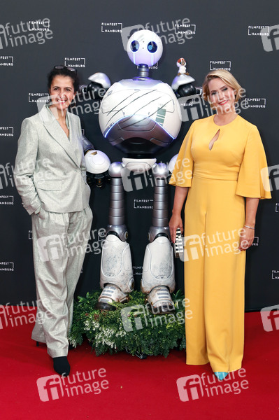Malika Rabahallah, Rozzum 7134 und Judith Rakers bei der Premiere des Animationsfilms 'Der wilde Roboter / The Wild Robot' auf dem 32. Filmfest Hamburg 2024 im Cinemaxx Dammtor. Hamburg, 27.09.2024