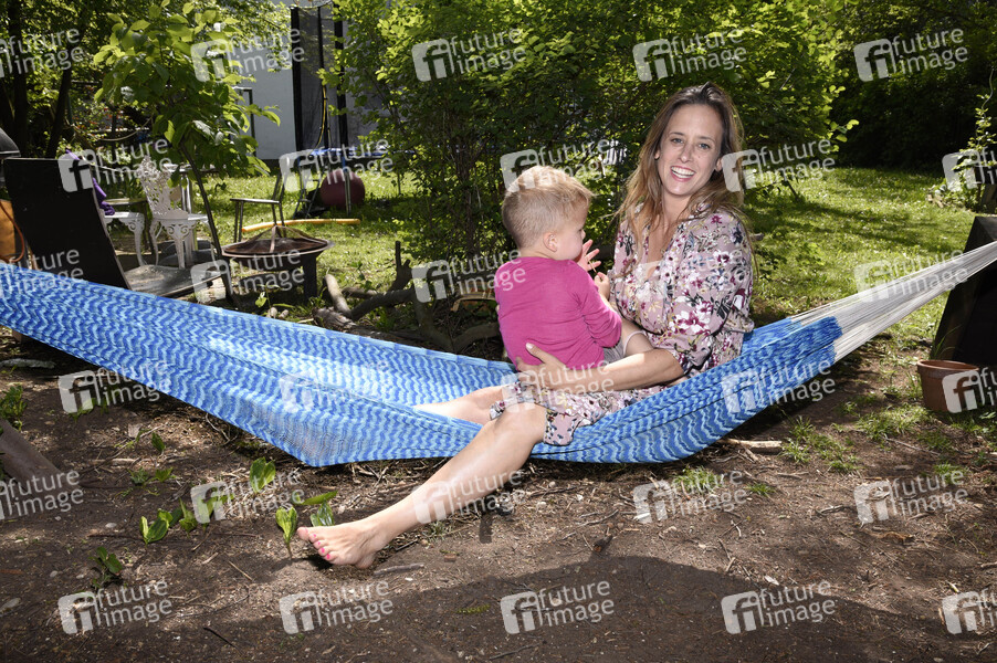 Stefanie Mendoni mit Sohn Lion bei einem exklusiven Fototermin im Garten. Ottobrunn, 08.05.2020