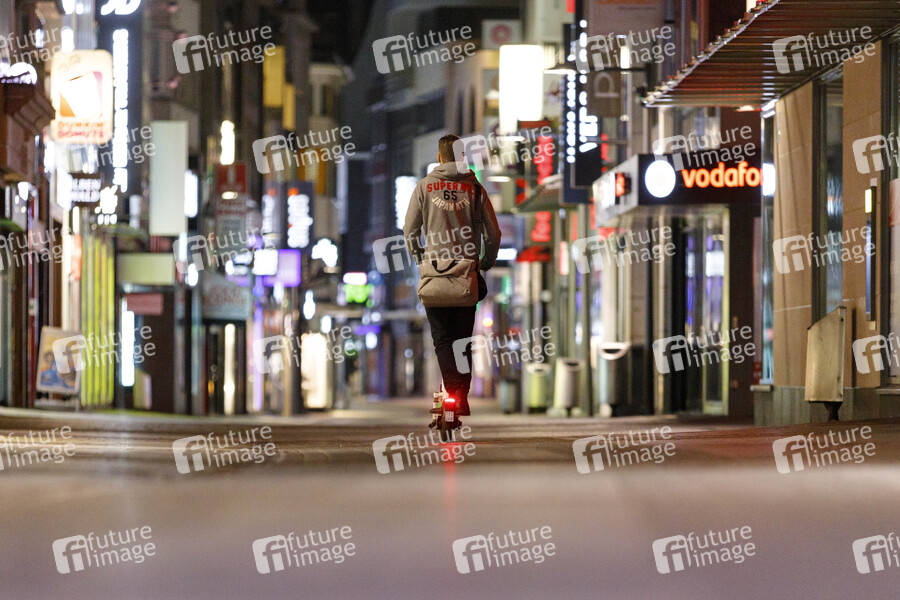 In Köln gelten seit dem 17.04.2021 um 0 Uhr Ausgangsbeschränkungen. Das Verlassen der Wohnung ist dann in der Zeit von 21 Uhr bis 5 Uhr fast ausnahmslos verboten. Die Beschränkungen beschloss der Krisenstab der Stadt Köln am Freitag. Ordnungsamt und Polizei kontrollieren die nächtlichen Straßen wie die Einkaufsstraße Hohe Straße im Bild. (Themenbild, Symbolbild) Köln, 17.04.2021