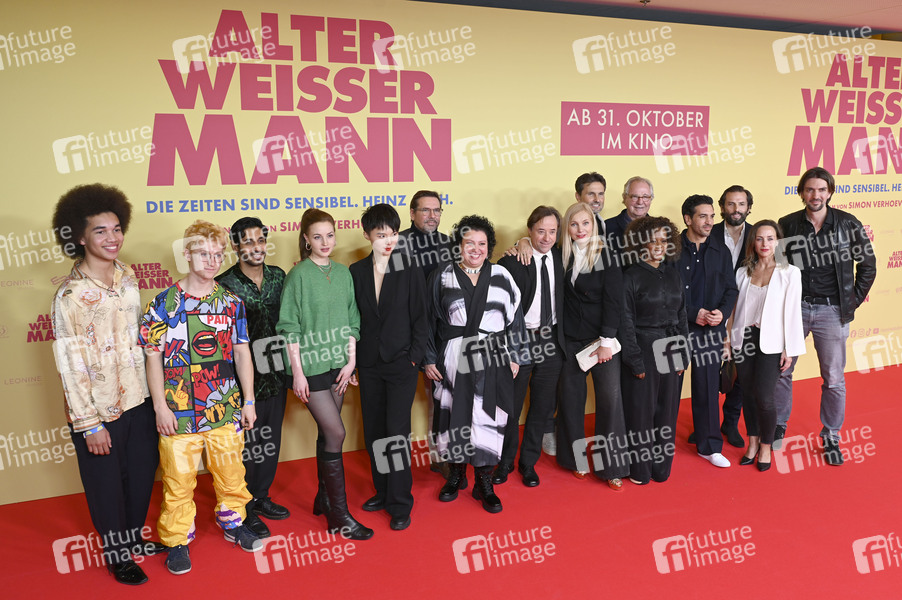 Leon Ndiaye, Juri Rother, Juri Sam Winkler, Sarah Mahita, Yun Huang, Michael Maertens, Meltem Kaptan, Jan Josef Liefers, Nadja Uhl, Simon Verhoeven, Friedrich von Thun, Denise M'Baye, Elyas M'Barek, Quirin Berg, Kirstin Winkler und Max Wiedemann bei der Weltpremieiere des Kinofilms 'Alter weißer Mann' im Mathäser Filmpalast. München, 22.10.2024