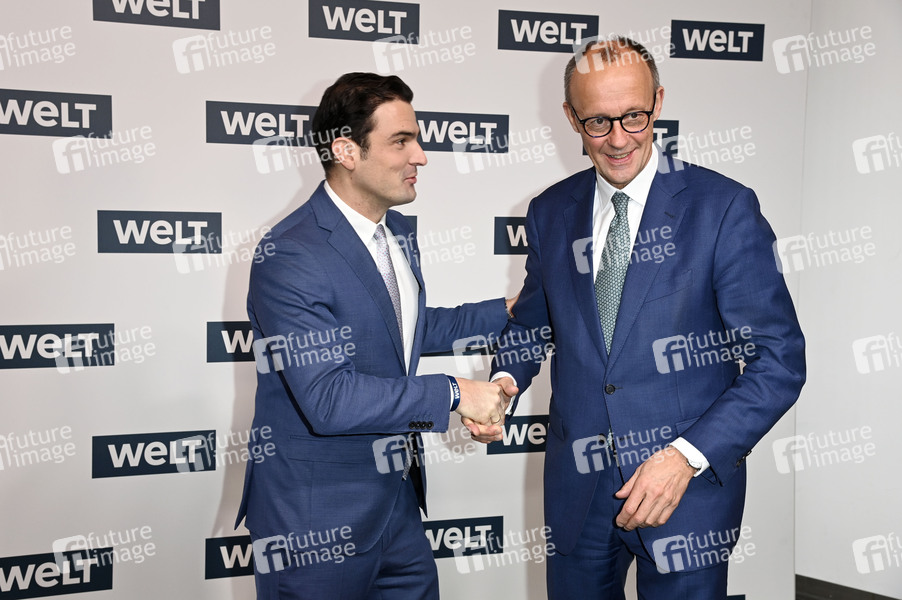 Jan Philipp Burgard und Friedrich Merz beim 16. WELT-Wirtschaftsgipfel 2025 im Axel-Springer-Haus. Berlin, 28.01.2025