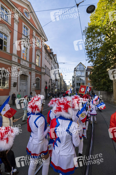 Die Tanzgarden beim Start des Erfuter Karnevals mit einem Mini-Umzug von ca. 2000 Erfurter Karnevalisten vom Hotel Radisson Blu über den Anger zum Fischmarkt vors Rathaus. Erfurt, 11.11.2022