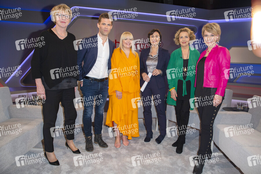 Susanne Langguth, Bas Kast, Melodie Michelberger, Sandra Maischberger, Michaela May und Andrea Ballschuh in der ARD-Talkshow 'Maischberger' im WDR Studio BS 3. Köln, 03.04.2019