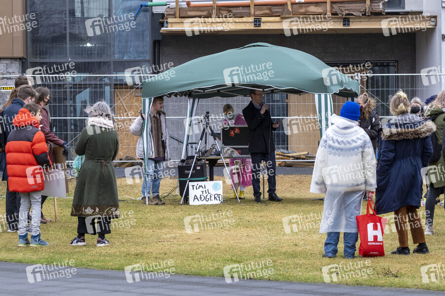Nur wenige Schüler und Studenten versammeln sich zum Global Climate Strike der Bewegung Fridays For Future vor dem Parlamentsgebäude. Ein Teil der Protestaktion findest auch online statt. Reykjavik, 19.03.2021