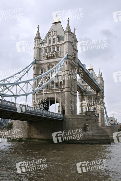 Klappbrücke, Neugotik, 244 Meter lang, Höhe der Brückentürme 65 Meter, die Fahrbahn zwischen den 61 Meter voneinander entfernten Türmen liegt neun Meter über dem Fluss, Fußgängerbrücke in 43 Meter Höhe, die beiden Baskülen können bis zu einem Winkel von 83 Grad hochgeklappt werden, Architekt Horace Jones, erbaut 1886 bis 1894, Themse