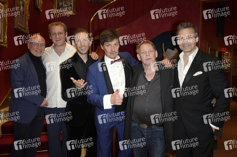 Dennis Schönwetter, Johannes Hallervorden, Marc Rudolf, Felix Martin Poenichen, Ben Becker und Marc Secara bei der Gala 'Hommage an Harald Juhnke' im Wintergarten Variete. Berlin, 01.04.2025
