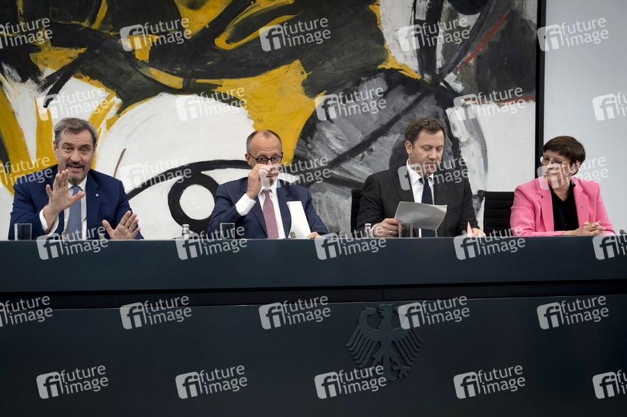 Markus Söder, Friedrich Merz, Lars Klingbeil und Saskia Esken bei der Pressekonferenz nach der ersten Sitzung des Koalitionsausschusses von Union und SPD im Kanzleramt. Berlin, 28.05.2025