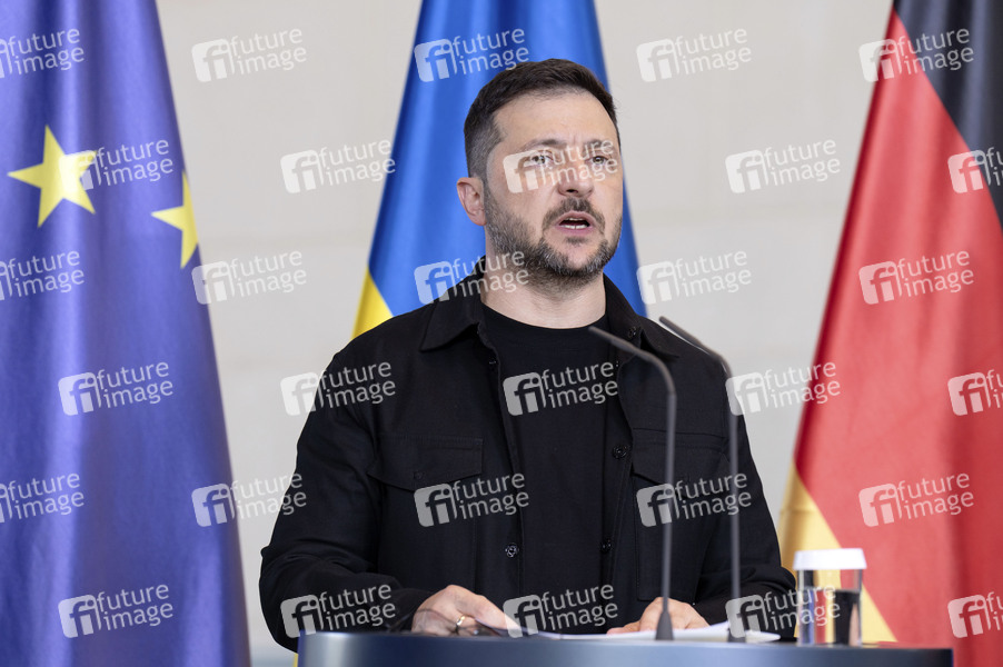 Wolodymyr Selenskyj beim Pressestatement zum virtuellen Treffen zur Ukraine im Bundeskanzleramt. Berlin, 13.08.2025