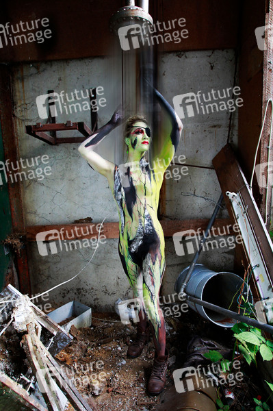 Bodypainting und Photoshooting mit Model Jutta auf einem Industriegelände in Hameln. Bodypaint-Künstler: Jörg Düsterwald, Make-Up und Hairstyling: Nadja Lück