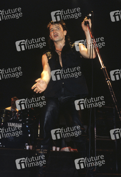 Larry Mullen Jr. und Bono von U2 live bei einem Konzert der 'The Unforgettable Fire'-Tour in der Wembley Arena. London, 14.11.1984