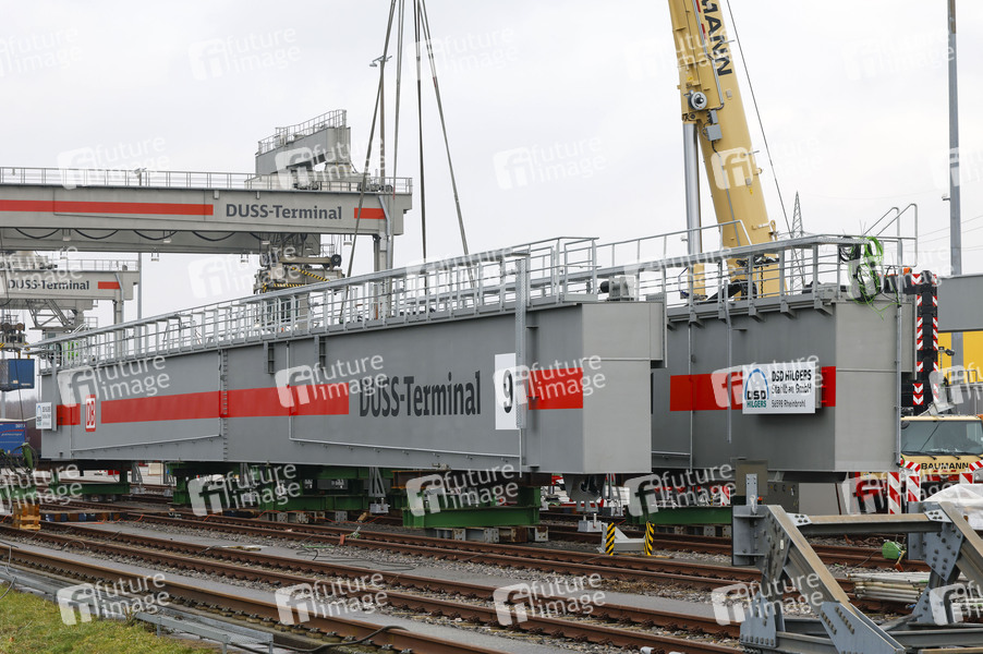 Portalkran beim Fototermin 'DB montiert 400 Tonnen schwere neue Krananlage' im DUSS-Terminal Köln-Eifeltor. Köln, 23.01.2025