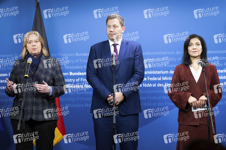 Bärbel Bas, Lars Klingbeil und Katherina Reiche beim Stahlgespräch mit Betriebsräten und Gewerkschaften im Finanzministerium. Berlin, 01.10.2025