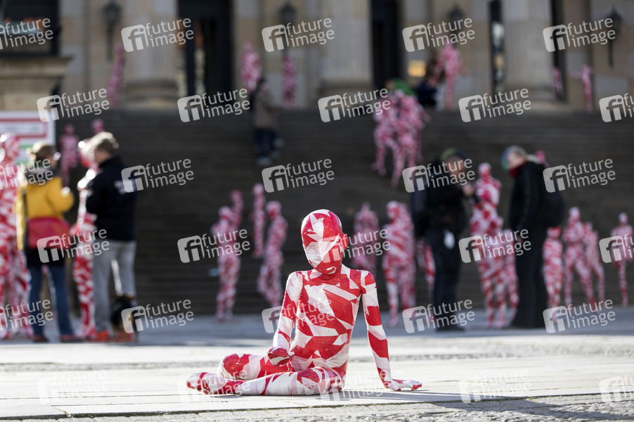 Installation 'It is like it is' des Künstlers Dennis Josef Meseg auf dem Gendarmenmarkt. Mit rotweißem Flatterband umwickelte Schaufensterpuppen sollen ein Mahnmal zur Coronakrise darstellen. Berlin, 03.04.2021