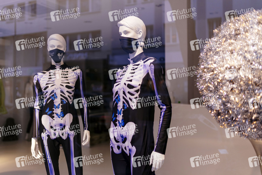 Einzelhändler auf der exklusiven Kölner Mittelstraße haben aus Protest gegen die Corona-Maßnahmen des Bundes, die sie zum Lockdown zwingen, Schaufensterpuppen zu Skeletten umgestaltet und mit Gesichtsmasken versehen. Sie fordern eine gerechtere Verteilung der Corona-Hilfspakete, eine sinnvollere Corona-Politik wie etwa eine stärkere Steuerentlastungen für den Einzelhandel oder eine Mietpreisbremse für Einzelhandelsgeschäfte. (Themenbild, Symbolbild) Köln, 11.01.2021