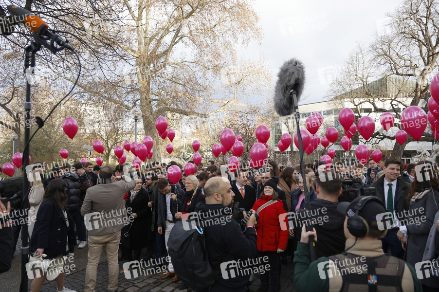 Franziska Brandmann und Mitglieder der Jungen Liberalen lassen traditionell Luftballons mit Forderungen steigen beim FDP Dreikönigstreffen 2025 im Stuttgarter Opernhaus. Stuttgart, 06.01.2025