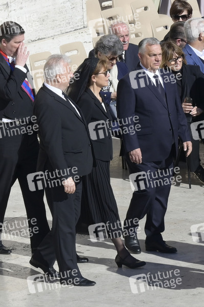 Viktor Orban mit Ehefrau Aniko Levai bei der Trauermesse für den verstorbenen Papst Franziskus auf dem Petersplatz. Vatikanstadt, 26.04.2025