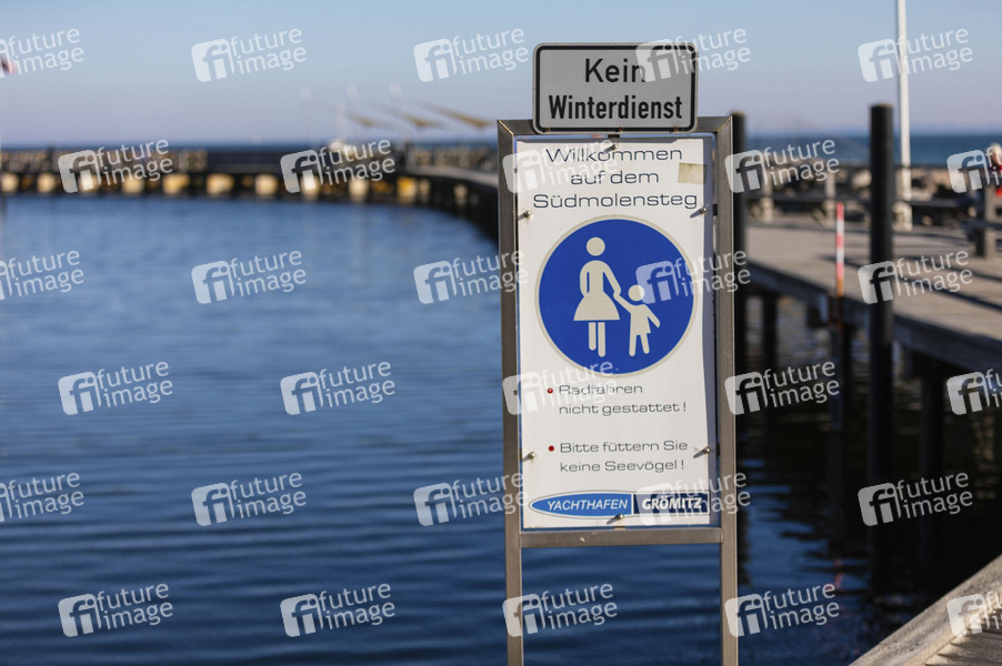 Verkehrsschild, Straßenverkehrsordnung, Gehweg, Straßenverkehrsordnung, Fußgänger, Frau mit Kind, Fußgängerverkehr, Verkehrsverbot für alle Verkehrsarten außer Fußgängern, StVO, Symbol, Piktogramm, Schild, Steg, Südmolensteg, Meer, Themenbild, Symbolbild