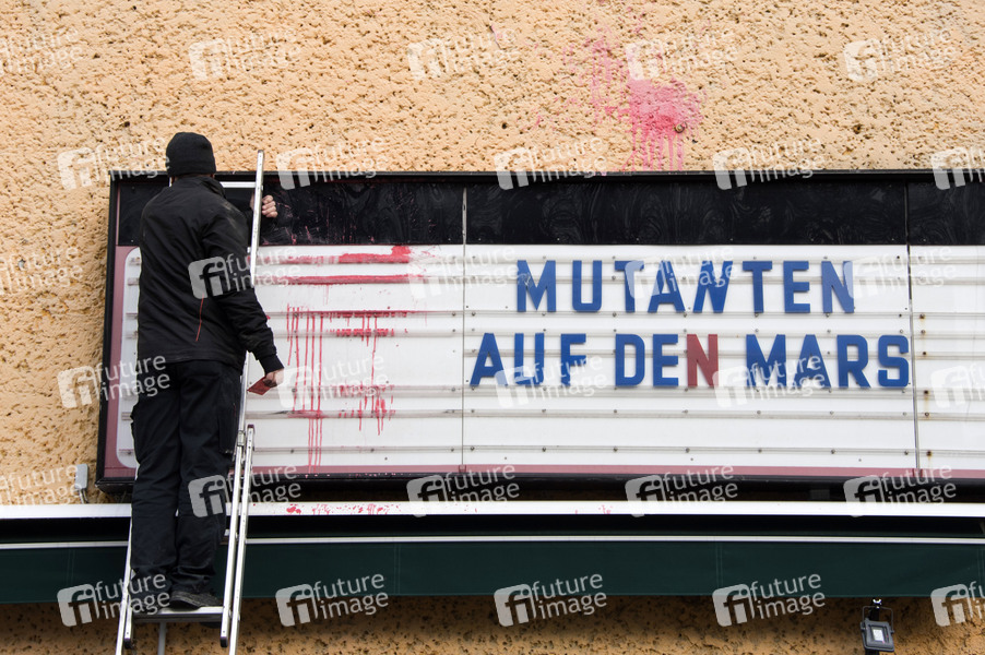 Im Zuge der Corona-Mutationen zeigen die Kinobetreiber des Kinos Brotfabrik mit dem Titel 'Mutationen auf den Mars', wohin sie sich die Mutationen des Corona-Virus wünschen. Berlin, 19.02.2021