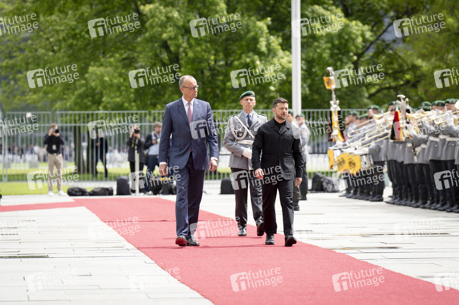 Friedrich Merz und Wolodymyr Selenskyj beim Empfang des Präsidenten der Ukraine mit militärischen Ehren und zu einem gemeinsamen Gespräch mit anschließendem Pressestatement im Bundeskanzleramt. Berlin, 28.05.2025
