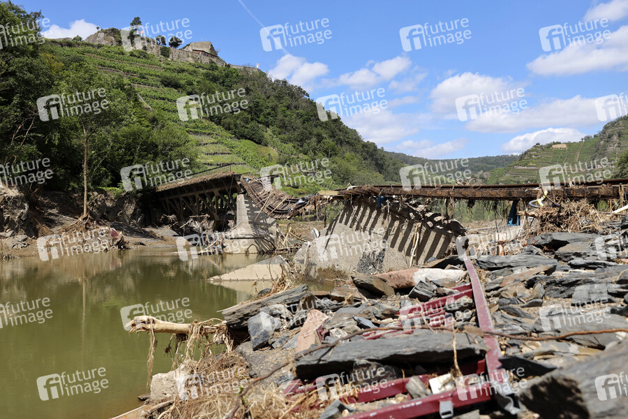 Nach dem Jahrhunderthochwasser in der Eifel durch heftige Regenfälle und Dauerregen mit Überschwemmungen und Überflutungen haben die Aufräumarbeiten im Ahrtal große Fortschritte gemacht. Einheiten von Polizei, THW, Bundeswehr und Feuerwehr mitsamt vielen freiwilligen Helfern haben Straßen geräumt, Schutt und Schlamm entfernt und die Menschen versorgt. Der Wiederaufbau wird trotzdem Jahre dauern. Im Bild Flutschäden nahe der Ortschaft Rech, in der die Flut viele Häuser zerstörte, 30.07.2021