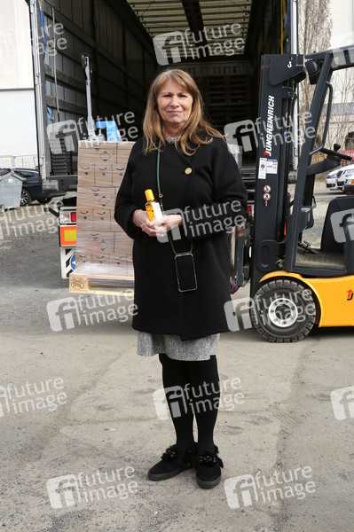 Petra Köpping beim Empfang einer Großspende von Händedesinfektionsmittelm der Beiersdorf AG an den Freistaat Sachsen bei der DRK Logistik HUB Sachsen GmbH. Dresden, 31.03.2020