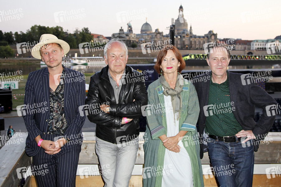 Robert Stadlober, Bernd Böhlich, Barbara Schnitzler und Stefan Kurt bei der Premiere des Kinofilms 'Und der Zukunft zugewandt' im Rahmen der Filmnächte am Elbufer. Dresden, 22.08.2019