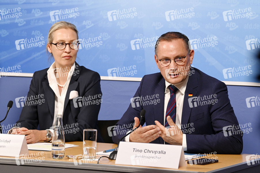 Alice Weidel und Tino Chrupalla bei der Pressekonferenz der AfD zur Europawahl 2024 im Haus der Bundespressekonferenz. Berlin, 10.06.2024