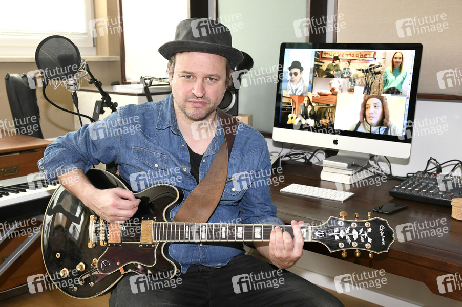 Phil Höcketstaller von Hundling beim aktuellen Tonstudio-Bahnhofsmission Spezial mit dem aktuellen Video 'Wofür?' in der Lockdown Version in seinem Tonstudio bei München. 17.02.2021
