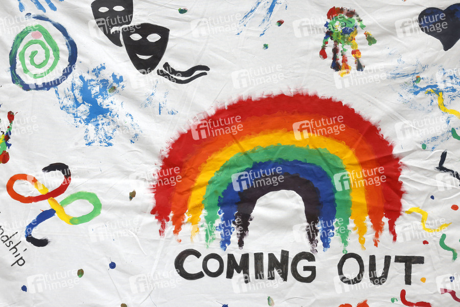 Der Schriftzug 'Coming Out' mit einem Regenbogen sichtbar in einem Schaufenster in Köln (Themenbild, Symbolbild) Köln, 31.10.2021