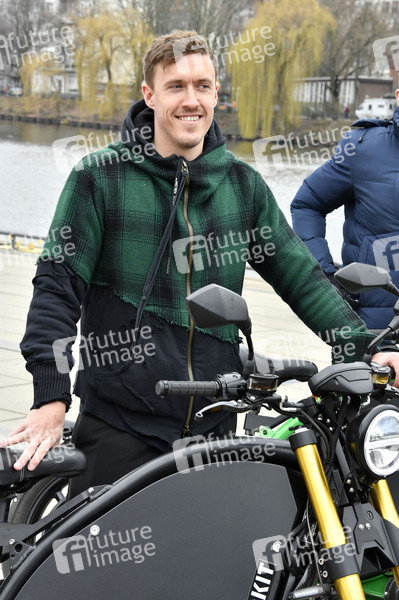 Max Kruse beim Fototermin zur Eröffnung der Zweiradsaison 2021 mit eROCKIT an der East Side Gallery. Berlin, 11.03.2021