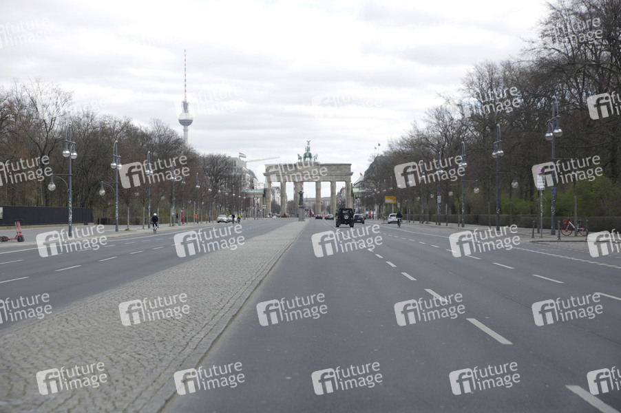 Die fast menschenleere Straße des 17 Juni mit Brandburger Tor und Fernsehturm. Die meisten Berliner halten sich offensichtlich an die Empfehlungen und Maßnahmen der Bundesregierung zur Bekämpfung der Corona-Epidemie. Berlin, 21.03.2020