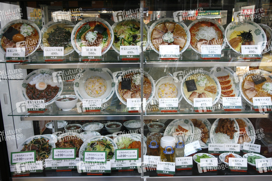 Muster von Gerichten aus Kunststoff vor Restaurant
