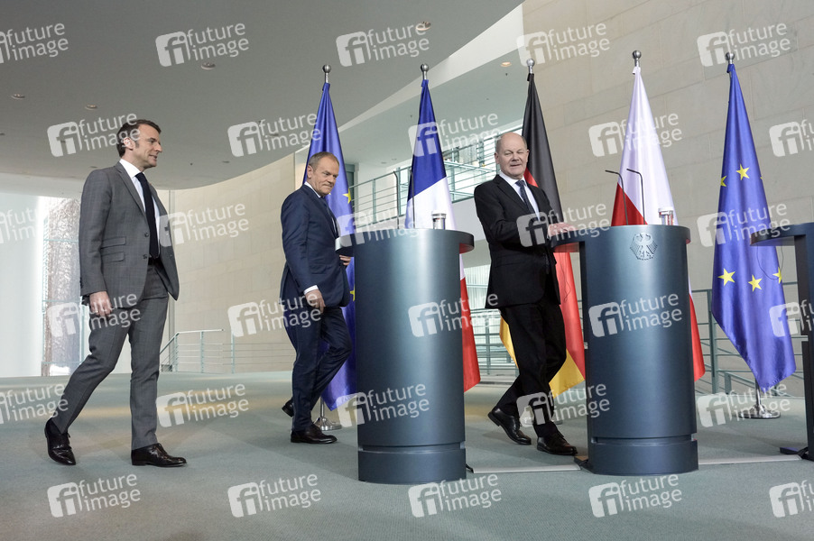 Emmanuel Macron, Olaf Scholz und Donald Tusk beim Pressestatement nach einem gemeinsamen Gespräch im Bundeskanzleramt. Berlin, 15.03.2024