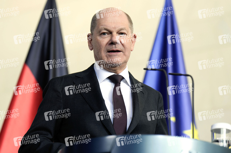 Olaf Scholz beim Empfang des Premierministers des Vereinigten Königreichs von Großbritannien und Nordirland mit militärischen Ehren und zu einem gemeinsamen Gespräch mit dem Bundeskanzler mit anschließendem Pressestatement im Bundeskanzleramt. Berlin, 24.04.2024
