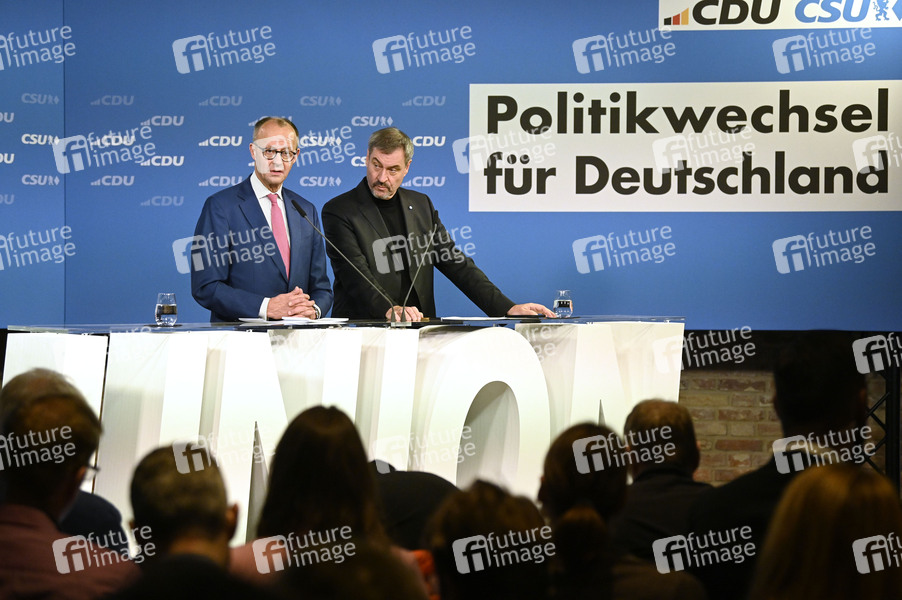 Friedrich Merz und Markus Söder in der gemeinsamen Sitzung der Vorstände der CDU Deutschlands und der CSU Bayern zur Beratung und Beschlussfassung des Wahlprogramms der CDU/CSU zur Bundestagswahl 2025 im Hotel Telegraphenamt. Berlin, 17.12.2024