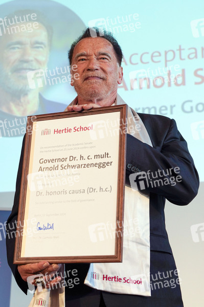 Arnold Schwarzenegger bei der Verleihung der Ehrendoktorwürde in Anerkennung seiner bedeutenden Beiträge im Bereich Governance, insbesondere durch seine Arbeit im Bereich Nachhaltigkeit und bürgerschaftliches Engagement in der Hertie School. Berlin, 17.09.2024