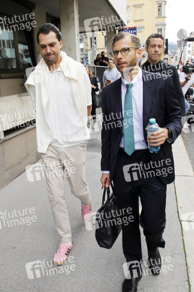 Jimi Blue Ochsenknecht mit seinem Anwalt Matthias Holzmann beim Verlassen des Gerichts nach dem Prozess wegen mutmaßlichen schweren Betrugs gegen Jimi Blue Ochsenknecht im Landesgericht Innsbruck. Innsbruck, 22.08.2025