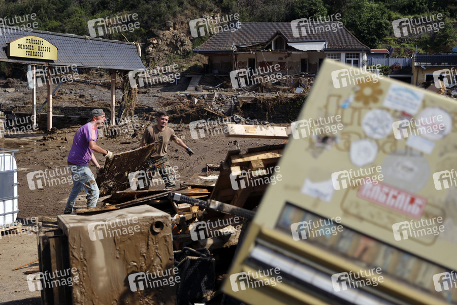 Nach dem Jahrhunderthochwasser in der Eifel durch heftige Regenfälle und Dauerregen mit Überschwemmungen und Überflutungen haben die Aufräumarbeiten im Ahrtal begonnen. Einheiten von Polizei, THW, Bundeswehr und Feuerwehr mitsamt vielen freiwilligen Helfern räumen Straßen, entfernen Schutt und Schlamm und versorgen die Menschen. Im Bild zerstörte Häuser in der Ortschaft Altenahr, in der die Flut viele Häuser zerstörte, 22.07.2021