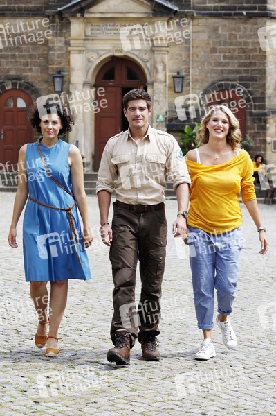 Liza Tzschirner, Philipp Danne und Eva-Maria Grein von Friedl am Set des ARD-Fernsehfilms 'Der Ranger - Paradies Heimat' auf dem Marktplatz. Stadt Wehlen, 14.08.2019