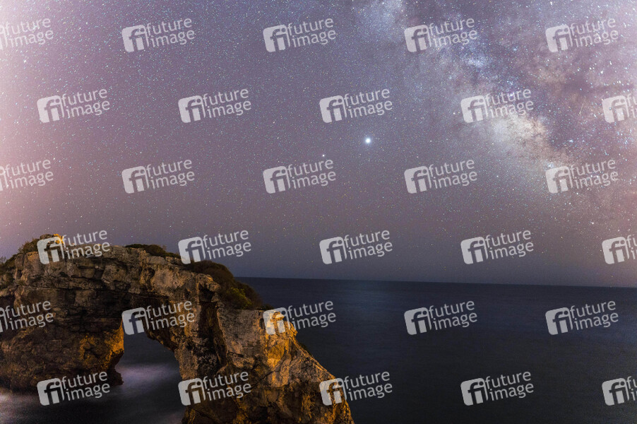Die Milchstraße über dem Cap Formentor. Das Milchstraßensystem besteht aus etwa 100 bis 300 Milliarden Sternen und großen Mengen interstellarer und Dunkler Materie. Mallorca, 20.07.2020