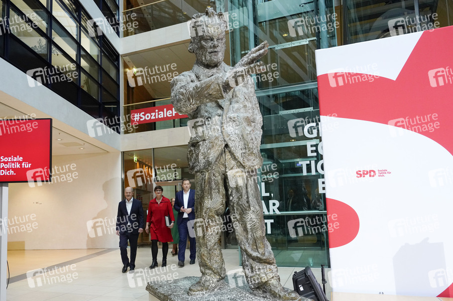 Olaf Scholz, Saskia Esken und Lars Klingbeil bei der Pressekonferenz der SPD nach den Gremiensitzungen zur Beratung aktueller Themen und der Nominierung des SPD-Kanzlerkandidaten für die Bundestagswahl im Atrium vom Willy-Brandt-Haus. Berlin, 25.11.2024