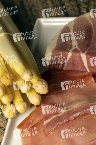 Ernährung, Malzeit, Essen, Lebensmittel, Nahrungsmittel, Fleisch, Schwein, Rind, Trockenschinken, Lachsschinken, Katenschinken, Haltbarkeit, pökeln, Vorderschinken, Parma-Schinken, Speck, Rohschinken, Spargel, Hinterschinken, Nitritpökelsalze, Symbolbild, Themenbild