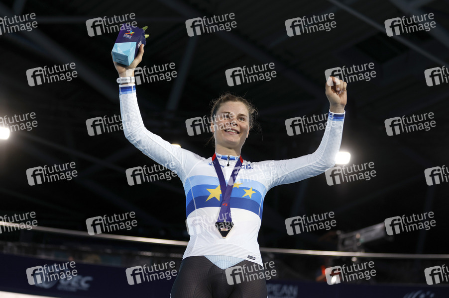 Lotte Kopecky bei der Siegerehrung Ausscheidungsfahren Frauen bei den European Championships 2022 im Bahnradsport in der Messe München. München, 13.08.2022