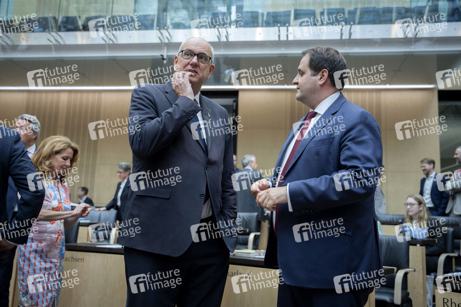 Andreas Bovenschulte und Nathanael Liminski beim Pressestatement am Rande der 1056. Sitzung des Bundesrates im Plenarsaal des Preußischen Herrenhauses. Berlin, 11.07.2025