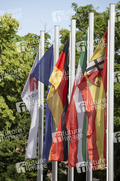 Fahnenmaste und Flaggen im Bundesviertel. Am 20. Juni 1991 verkündete die damalige Bundestagspräsidentin Rita Süssmuth in der Plenarsitzung im alten Wasserwerk die Entscheidung zum Umzug von Parlament und Regierung nach Berlin. Bis 1990 war Bonn die Hauptstadt der Bundesrepublik Deutschland und bis 1999 Regierungssitz. Seit 1951 ist Bonn ein Sitz der Vereinten Nationen. Heute ist Bonn der zweite Regierungssitz. Bonn, 19.06.2021