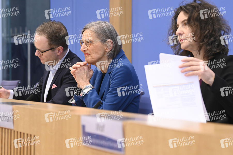Philipp Denker, Dorothea Störr-Ritter und Sabine Kuhlmann bei der Bundespressekonferenz zur Vorstellung des Gutachten des Nationalen Normenkontrollrats zu 'Bündelung im Föderalstaat - zeitgemäße Aufgabenorganisation für eine leistungsfähige und resiliente Verwaltung' im Haus der Bundespressekonferenz. Berlin, 03.02.2025