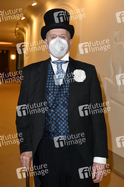 Peer Martiny beim Fototermin mit dem (getesteten) Ensemble des Theaterstücks 'Vorhang auf für Cyrano' in Maske und Kostüm vor dem Testzentrum im Schiller Theater. Unter dem Motto 'Testen statt spielen' eröffnen die Komödie am Kurfürstendamm und der KitKatclub ein gemeinsames Testzentrum im Schiller Theater. Berlin, 07.04.2021