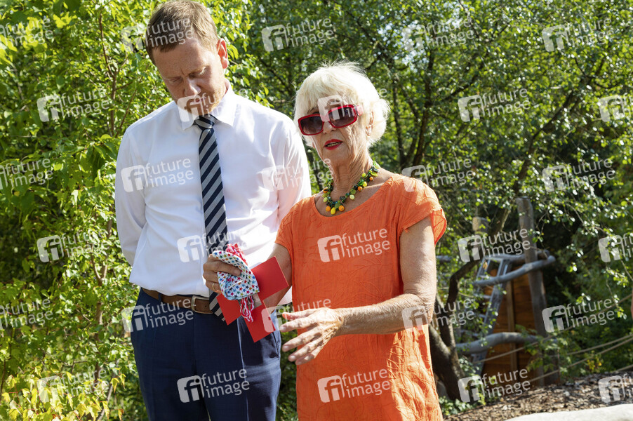 Michael Kretschmer und Monika Ehrhardt-Lakomy bei der Eröffnung des ersten bundesweiten Traumzaubergartens nach Motiven aus dem 'Traumzauberbaum' von Reinhard Lakomy in der DRK-Kindertagesstätte 'Findikus'. Bautzen, 12.08.2020