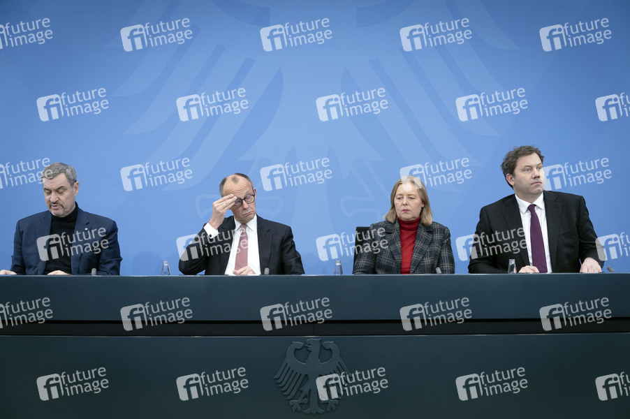 Markus Söder, Friedrich Merz, Bärbel Bas und Lars Klingbeil bei einer Pressekonferenz nach der Sitzung des Koalitionsausschusses von Union und SPD im Kanzleramt. Berlin, 28.01.2026